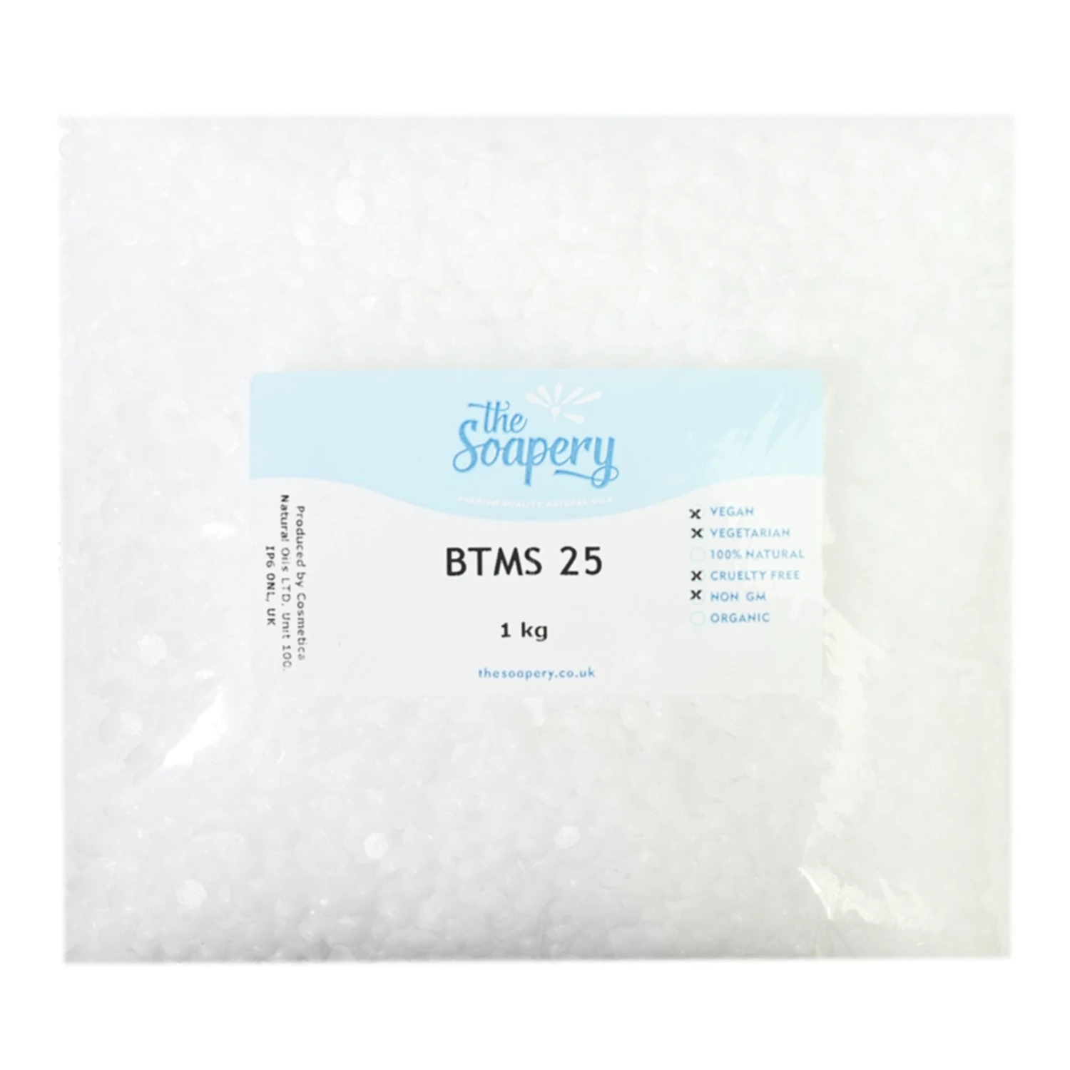 BTMS 25 is white, waxy ingredient that comes in small pellets. It is a cationic emulsifying wax that is very conditioning for skin and hair.