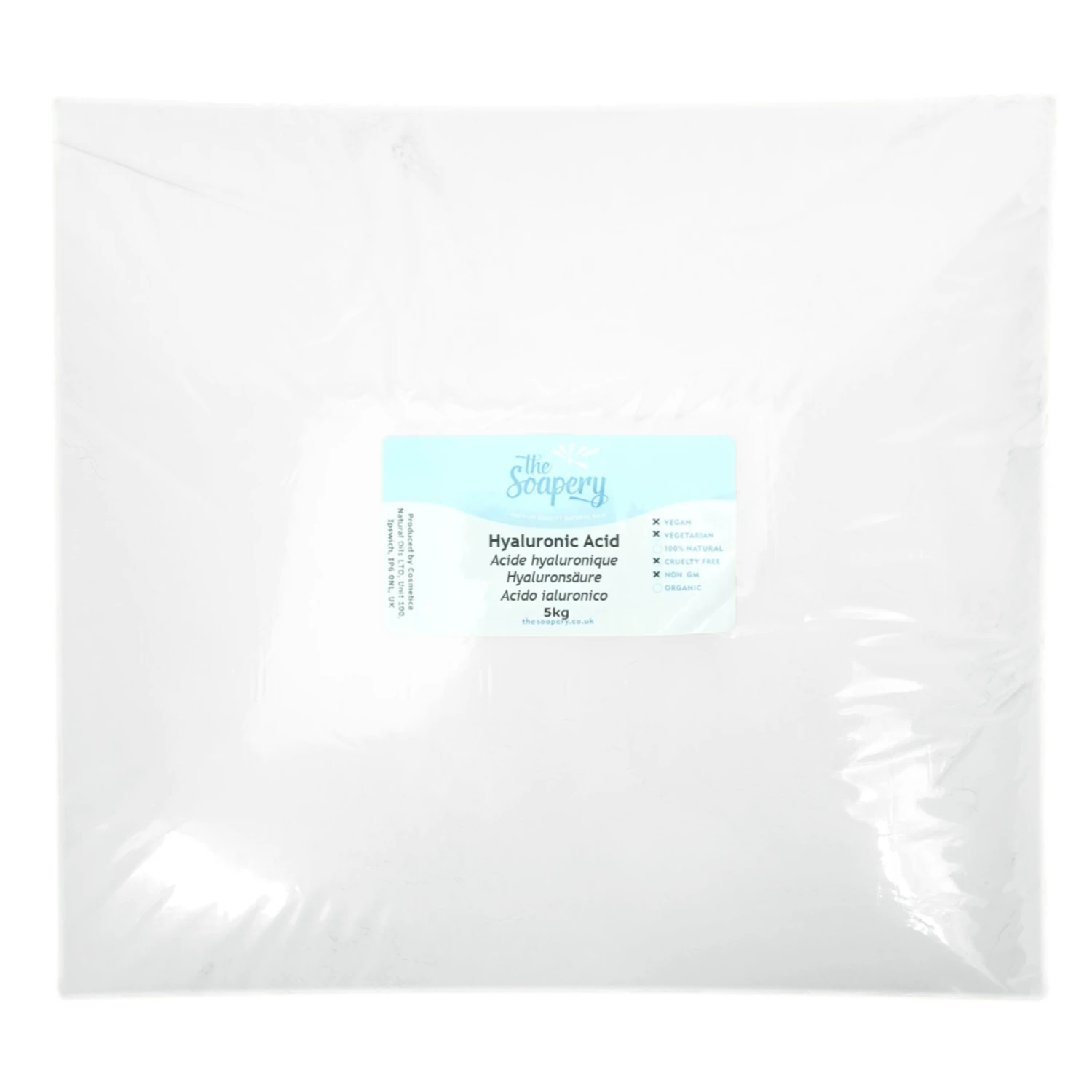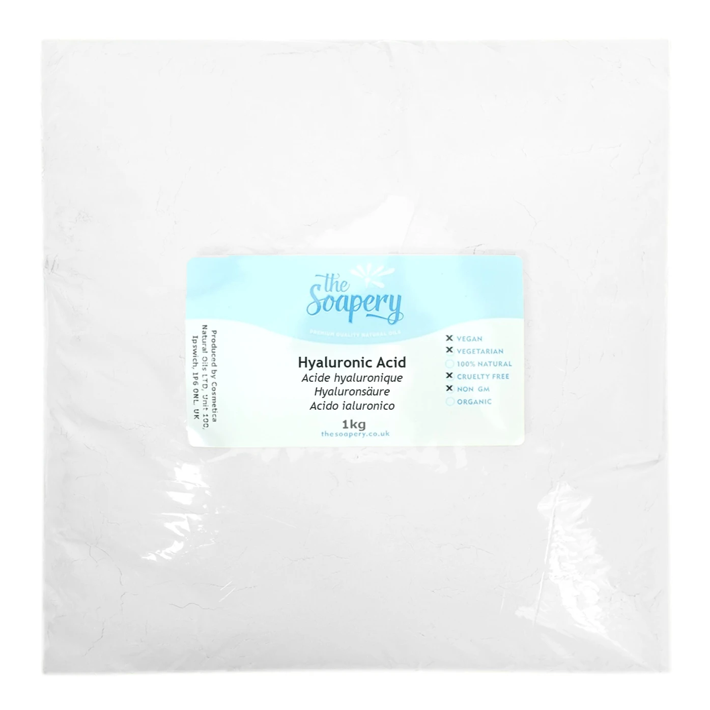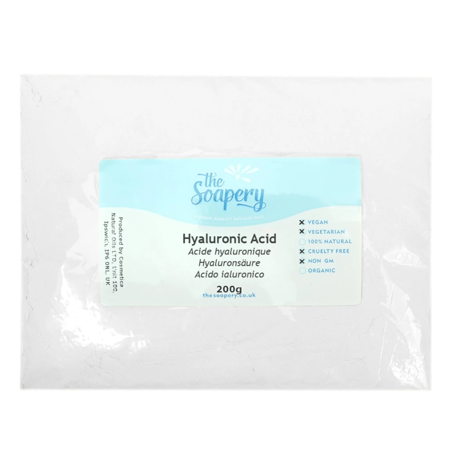 Hyaluronic acid is naturally found in the body, particularly around the eyes and joints. Our hyaluronic acid is made from bacterial fermentation. It is a fine white powder, often used for its humectant properties which draws in moisture and hydration to all skin types.