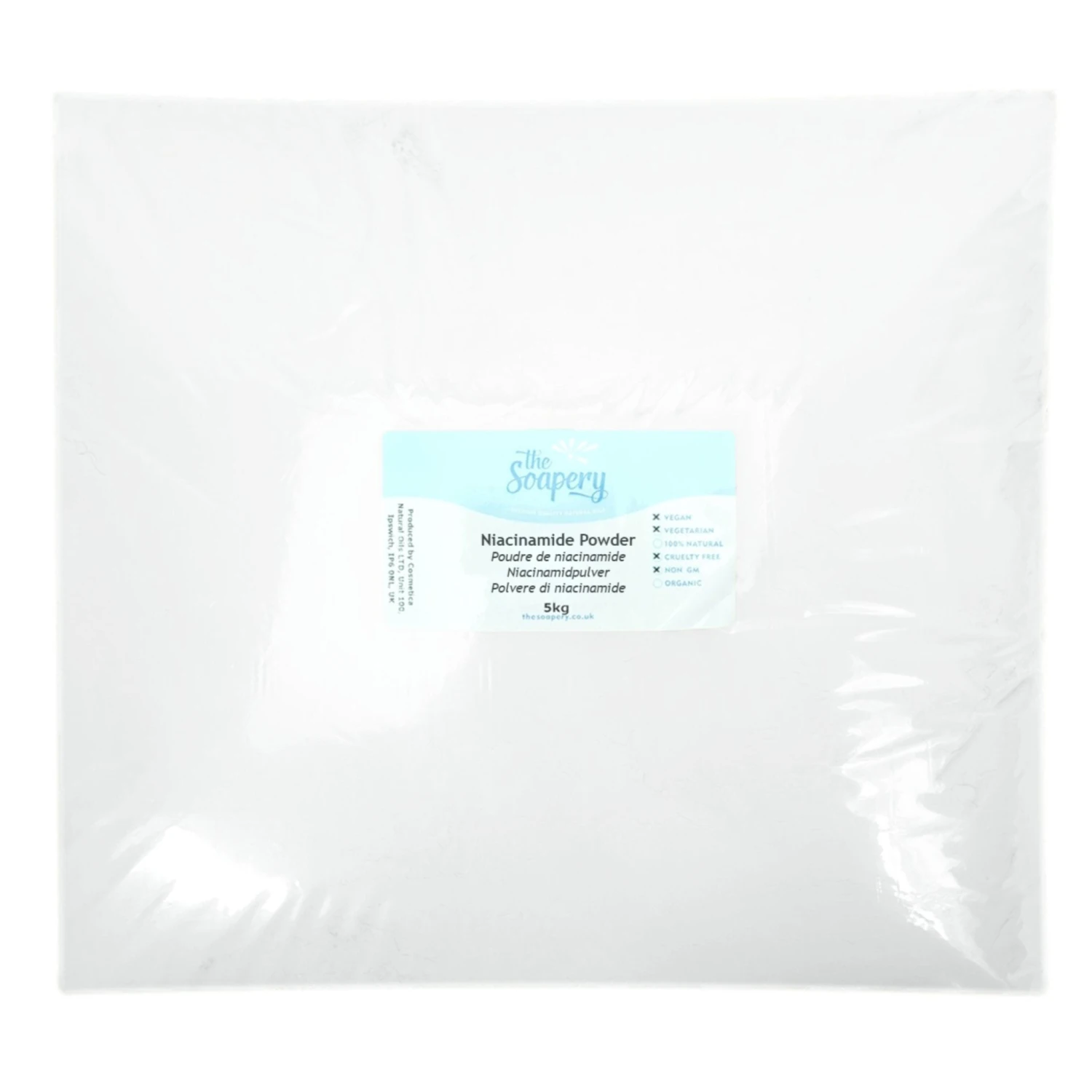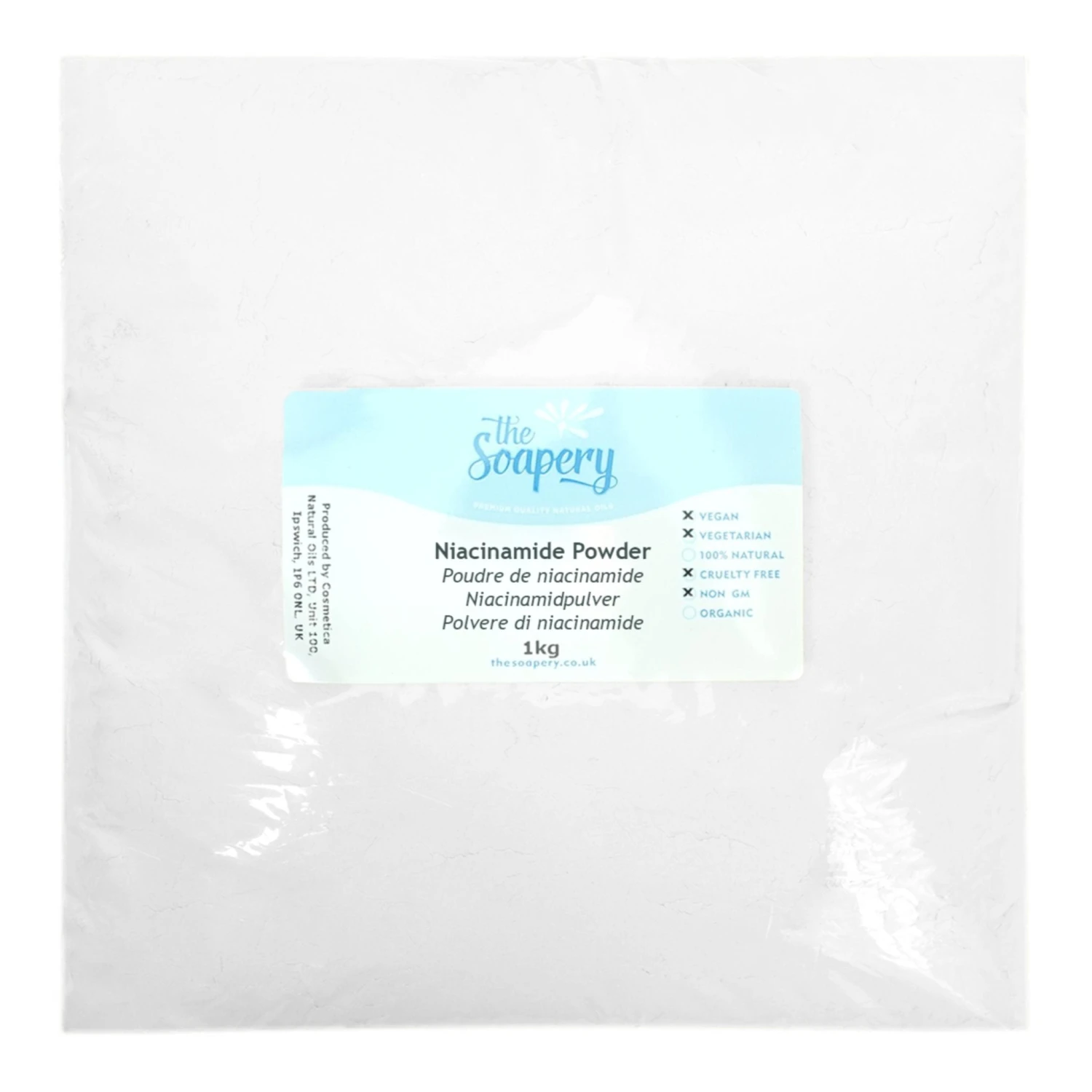 Niacinamide powder (also know as vitamin B3) is a fine white powder. The powder is water soluble and dissolves well in a water based treatment.
