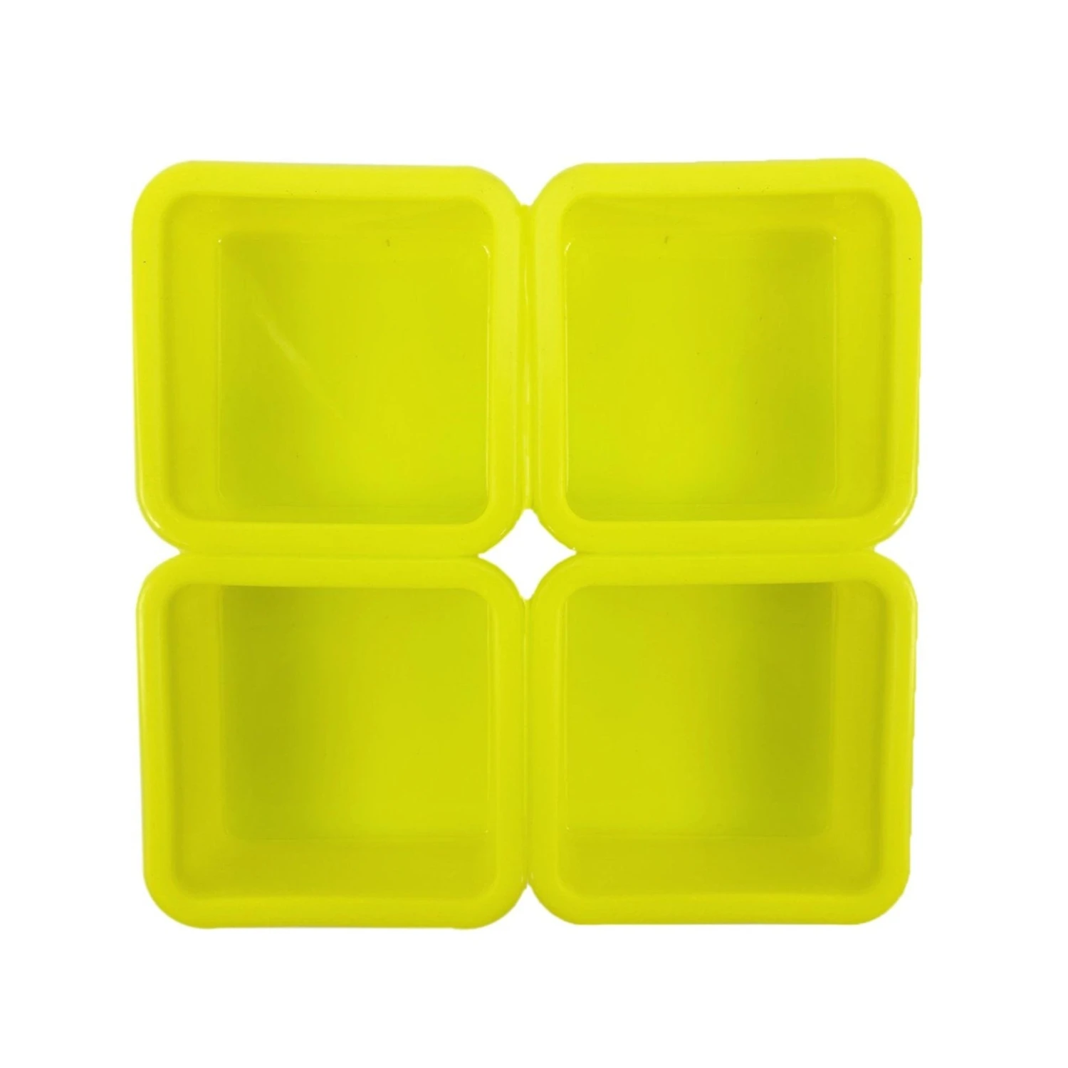 The dimensions for the square silicone moulds are: 6.2cm x 6.2cm x 3cm. Each cell makes around 125g of soap.Β The colour of the moulds vary.